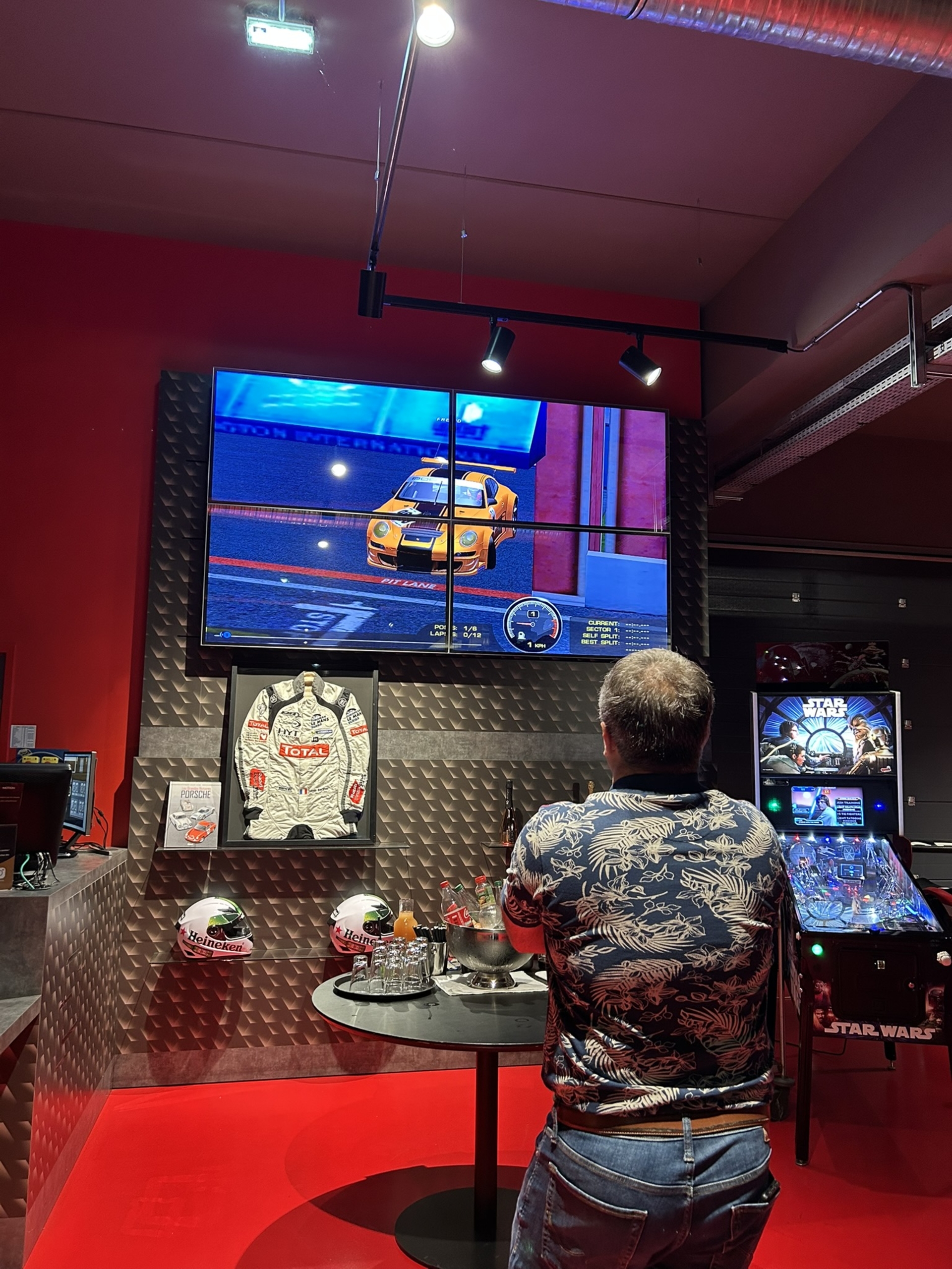 Dans la confortable salle d’accueil des simulateurs, vous pourrez profiter des écrans géants, pour surveiller la course, encourager (ou pas) les participants qui s’affrontent.